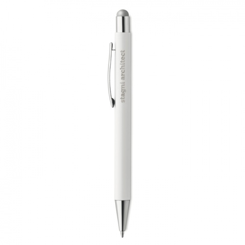 OPIS: Długopis z aluminium, wciskany mechanizm. Po wygrawerowaniu logo na korpusie pojawia się kolor identyczny jak miękkiej końcówki dotykowej. Niebieski tusz.