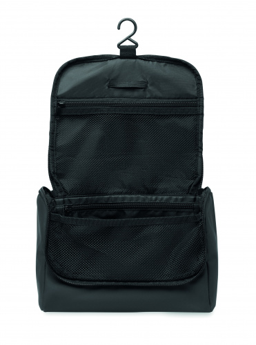 OPIS: Kosmetyczka z miękkiego PU z haczykiem do zawieszania i podszewką 210D RPET. Jedna duża komora główna z wewnętrzną przegrodą z siatki zapinaną na zamek i 1 przegrodą z siatki.