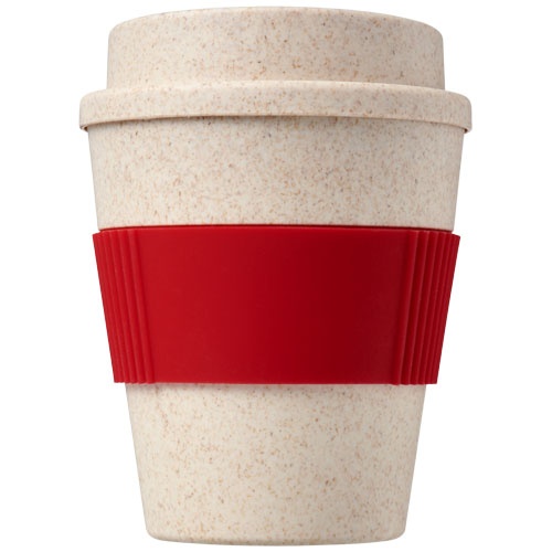 OPIS: Kubek ze słomy pszenicy Oka o pojemności 350 ml. Jednowarstwowy kubek z nakręcaną pokrywką, wykonany w 50% z włókna słomy pszenicy i w 50% z tworzywa sztucznego PP. Posiada silikonowy uchwyt. Mieści się w większości ekspresów do kawy. Pojemność wynosi 350 ml. 50% włókno słomy pszenicy, 50% tworzywo sztuczne PP.