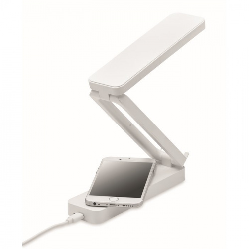 OPIS: Składana lampa biurkowa wykonana z ABS z 14 diodami LED, z 3 poziomami jasności, z bezprzewodową ładowarką 10W. Wyjście: DC 9V/1.1A (10W) do szybkiego ładowania.
