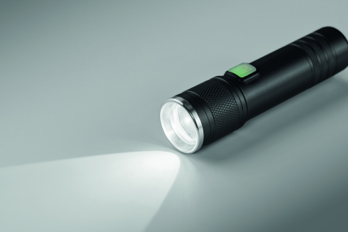 OPIS: Latarka COB z możliwością ładowania, wykonana z aluminium pochodzącego z recyklingu. 100 lumenów z 3 ustawieniami światła i funkcją zoom. Wbudowany akumulator o pojemności 800 mAh. Kabel do ładowania w zestawie.