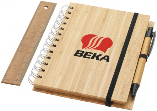 OPIS: Notes z długopisem Franklin. W zestawie: notatnik z grzbietem spiralnym i bambusową okładką, pasujący długopis oraz linijka. Notatnik zawiera 70 kartek w linie. Nadruk niemożliwy na poszczególnych elementach. Bambus.