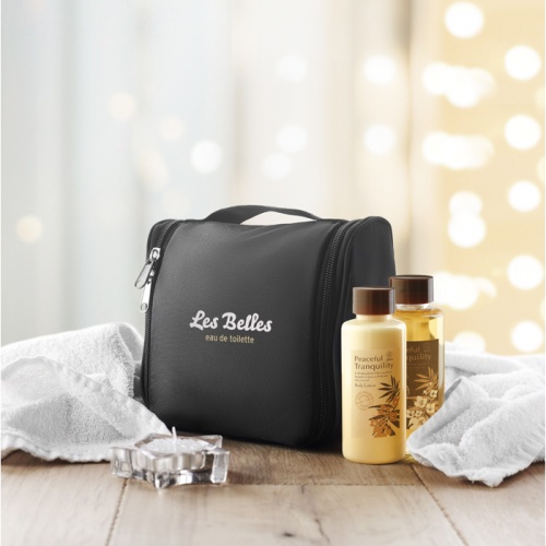 OPIS: Wisząca kosmetyczka z wieloma przegrodami i siatkowymi kieszeniami na drobiazgi niezbędne w podróży. Mocny polyester. Doskonała na podróż służbową lub turystyczną. Z duża powierzchnią pod nadruk reklamowy