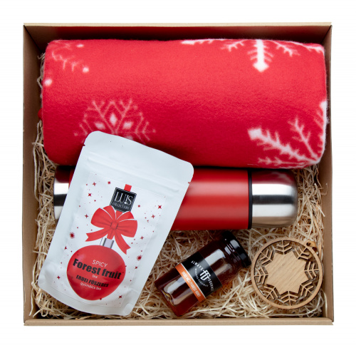 OPIS: Podróżny zestaw prezentowy w kartonowym pudełku upominkowym z wypełnieniem z wełny drzewnej i czerwoną wstążką. Zawiera: koc świąteczny „Uppsala”; termos "Geisha"; herbatę z owoców leśnych „Luis” (30 g); miód leśny „Always Gourmet” (125g); ozdobę choinkową "Lundamo".
