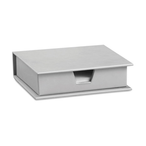 OPIS: Praktyczny kartonowy pojemnik na karteczki w kształcie prostokąta. Dołączone 100 arkuszy papieru z recyklingu. 2-częściowy bloczek karteczek samoprzylepnych. Średnie żółte karteczki samoprzylepne i 5 markerów w różnych kolorach.