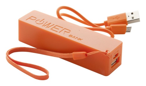 OPIS: Plastikowy power bank o pojemności 2000mAh. Zestaw zawiera pasek i kabel ładujący USB.