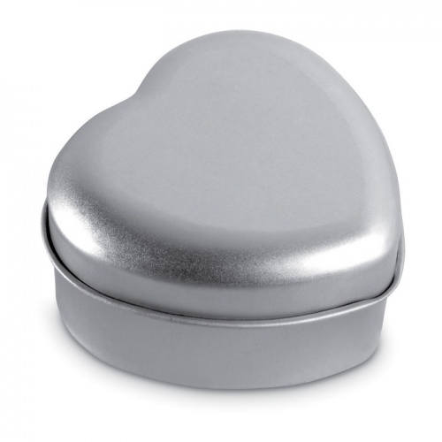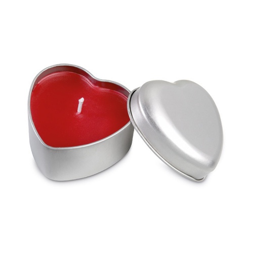 OPIS: Czerwona świeczka w kształcie serca o zapachu wanilii, w srebrnym metalowym pudełku. Indywidualne pudełko.