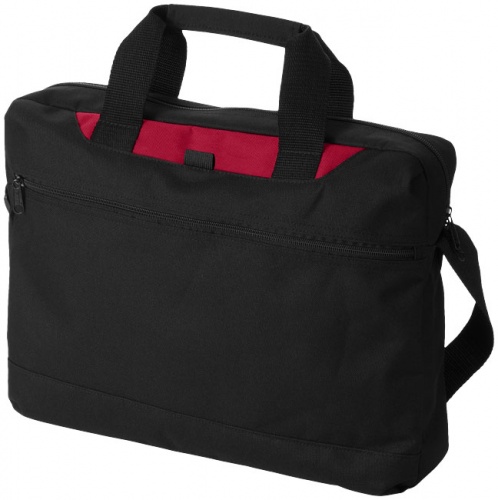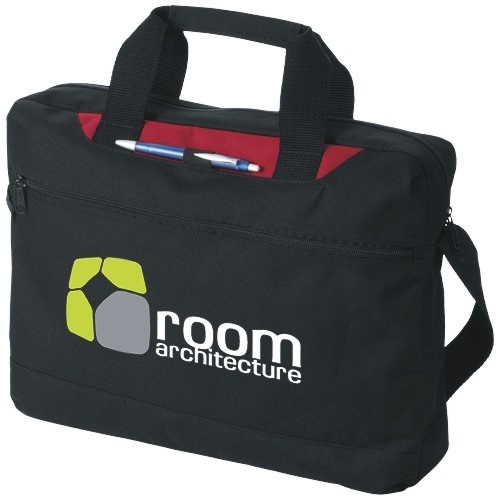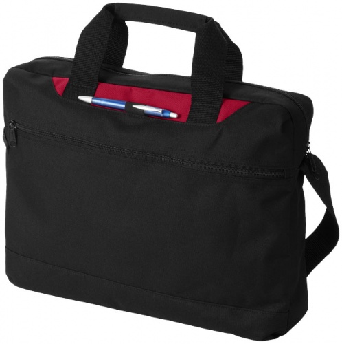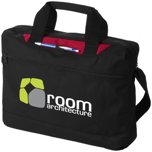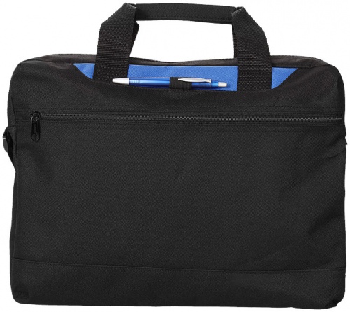 OPIS: Torba konferencyjna Dallas. Torba konferencyjna z kolorowym panelem posiadająca przegrodę główną i kieszeń przednią zamykane na zamek oraz zewnętrzny uchwyt na długopis. Dołączono pas na ramię o regulowanej długości. Zestaw nie zawiera długopisu. Poliester 600D.