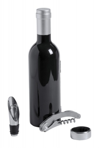 OPIS: Zestaw do wina w kształcie butelki. Z korkociągiem, pierścieniem przeciw kapaniu i końcówką do nalewania.