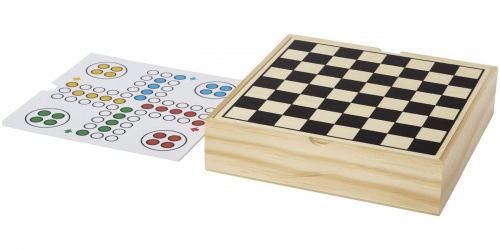 OPIS: Zestaw gier karcianych Monte Carlo. Drewniane pudełko z kilkoma przegrodami do gry w backgammona, szachy, warcaby, domino, ludo, mikado i najróżniejsze gry karciane. Dwustronne wieko z gładkim frontem do dekoracji i plansza do gry w szachy/warcaby na odwrocie. Dodatkowa papierowa wkładka do gry w ludo i backgammona. Instrukcja w zestawie. Drewno.